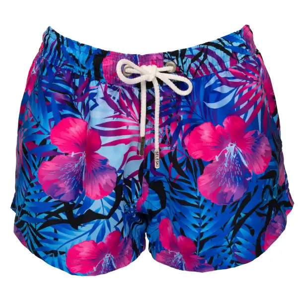 Liga elástica en la cintura del short, tortuga bordada en la parte inferior izquierda, cordones de altísima calidad con terminación de acero grabada Seleski. 2 bolsillos laterales. 1 bolsillo trasero sin tapa. 100% Polyester. Recomendados para uso en playa y piscina. Secado rápido. Malla interna. Las medidas están especificadas en la tabla de medidas. Peso aproximado de 400 gramos.